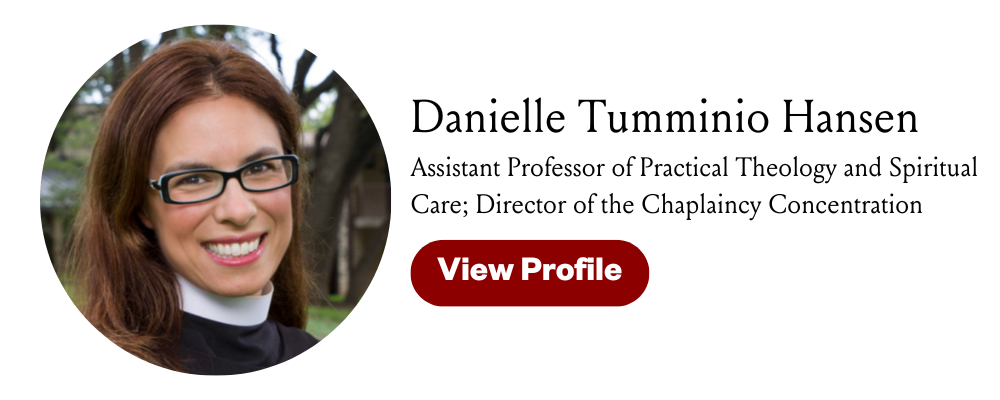 The Rev. Dr. Danielle Tumminio Hansen joined the Candler faculty in 2021. Prior to arriving at Candler, she was assistant professor of pastoral theology and served as director of field education at Seminary of the Southwest in Austin, Texas, where she taught courses on trauma, practical theology, and pastoral theology, with a feminist, intersectional, and anti-racist lens. Tumminio Hansen has been a lecturer at Yale and Tufts universities, in addition to serving as chaplain at Groton School and as a parish priest in Lexington, Lincoln, and Quincy, Massachusetts.