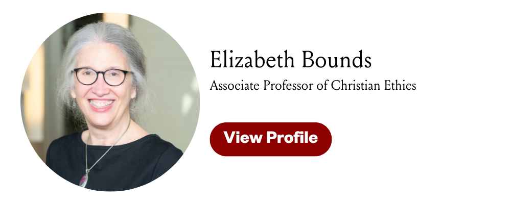 Dr. Elizabeth M. Bounds, who joined Candler’s faculty in 1997, is engaged in the Justice, Peacebuilding, and Conflict Transformation Concentration, part of the Master of Divinity degree program at Candler. She also teaches courses as part of the Religion, Conflict, and Peacebuilding Concentration in Emory’s Graduate Division of Religion.